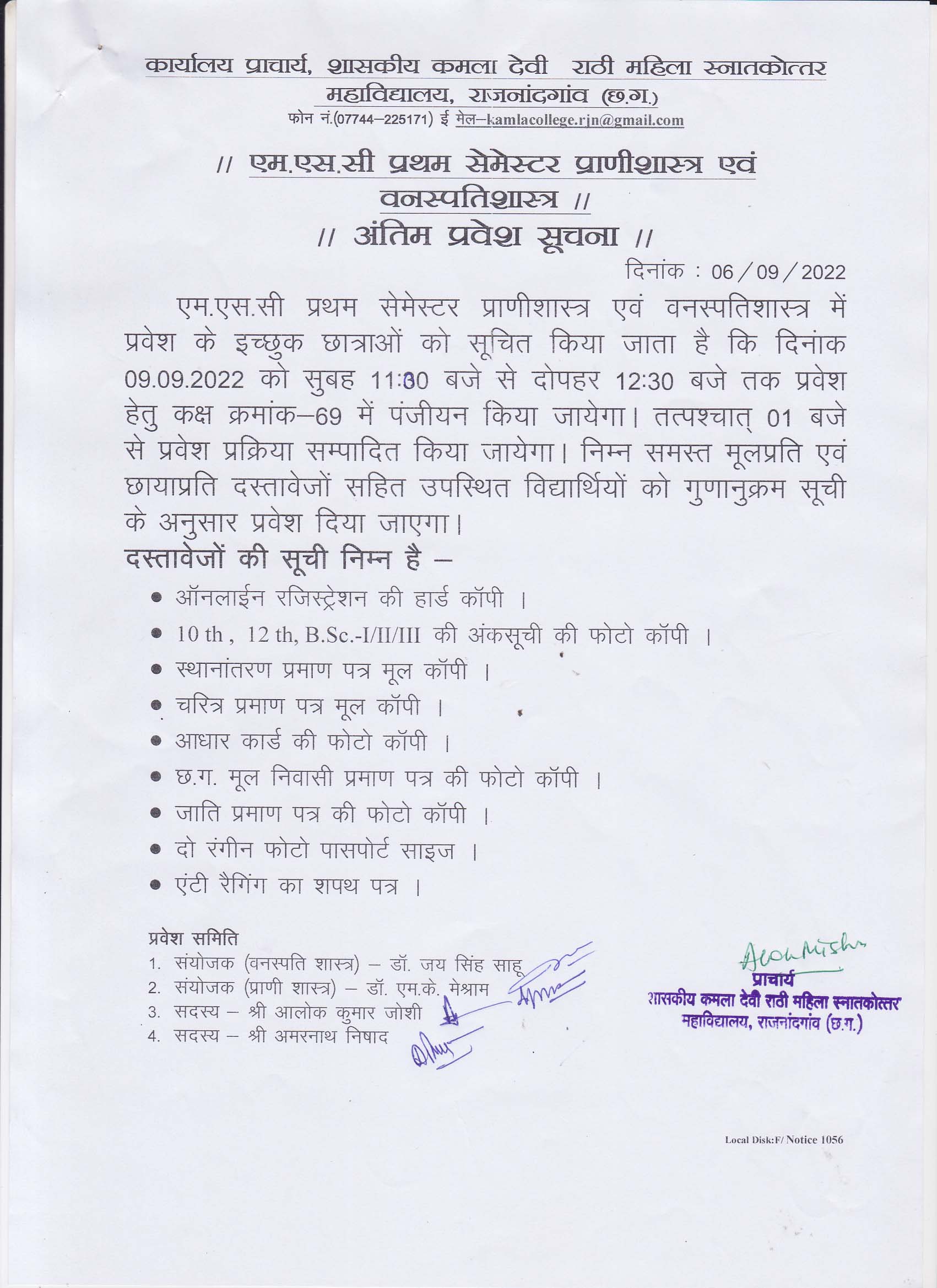 एम.एस.सी. प्रथम सेमे. प्राणीशास्त्र एवं वनस्प्तिशास्त्र अंतिम प्रवेश सूचना |
